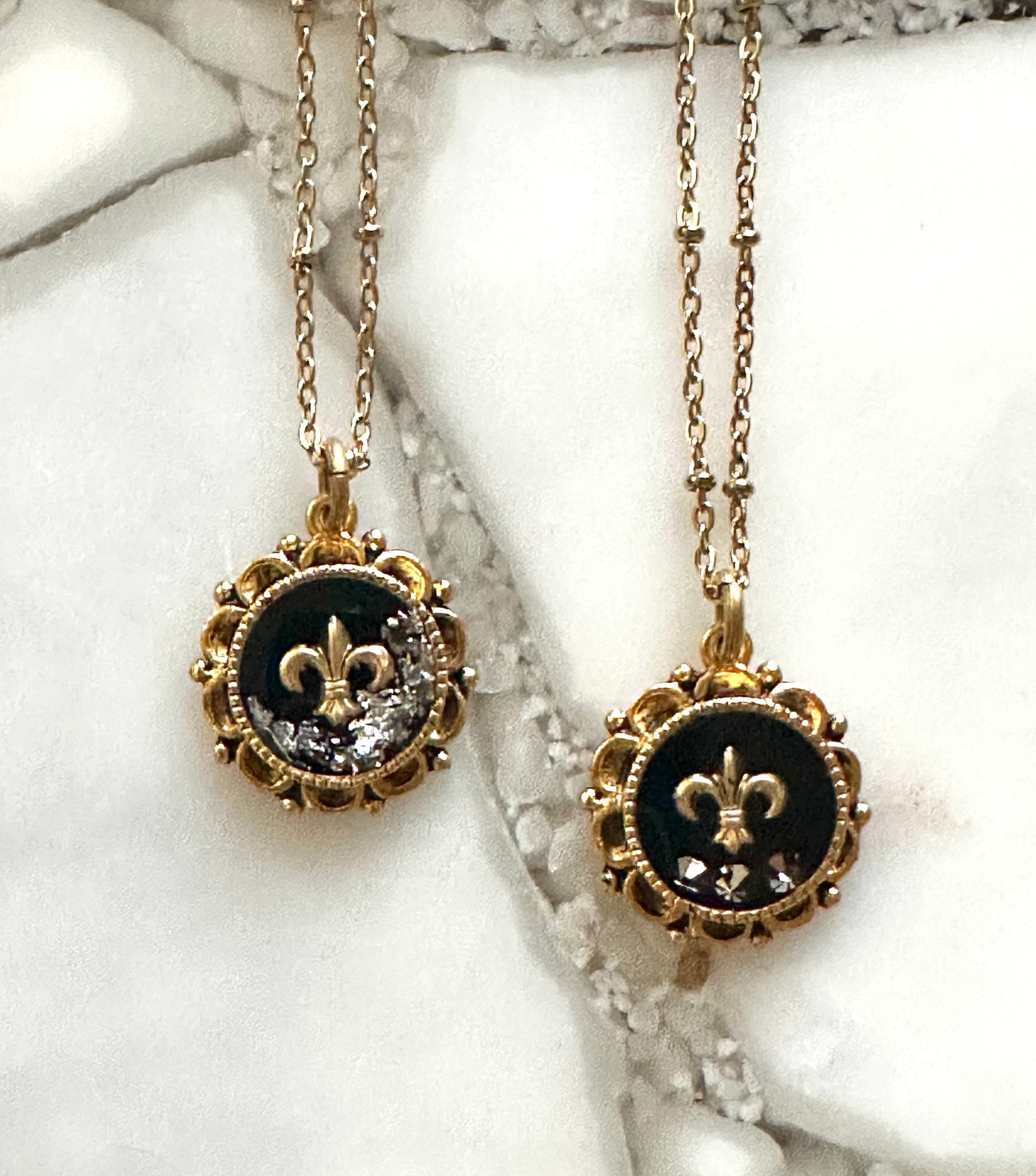 Meet your new favorite necklace—the Fleur de Lis Ornate Necklace! This charming piece brings a touch of old-world glamour with a modern twist. The necklace is designed with hand pigmented resin in black to showcase the tiny fleur de lis charm. Each necklace has it's own unique touch. One with crushed German Glass, the other with Czech crystals. There is also a party in the back of the pendant.